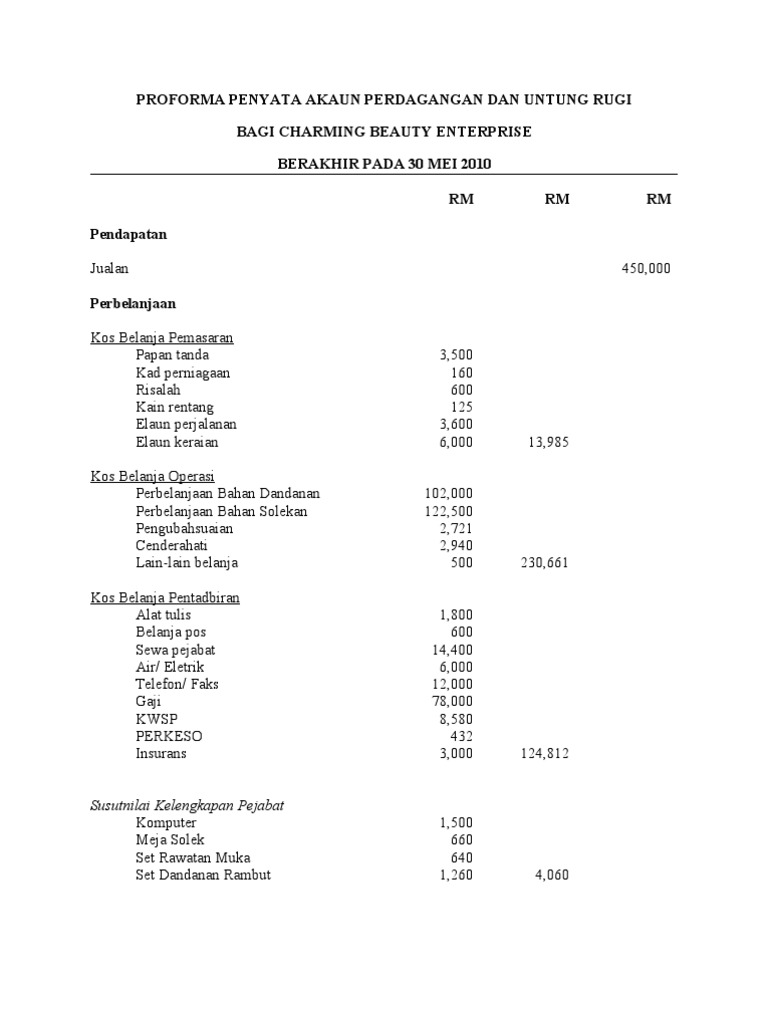 Proforma Penyata Akaun Perdagangan Dan Untung Rugi