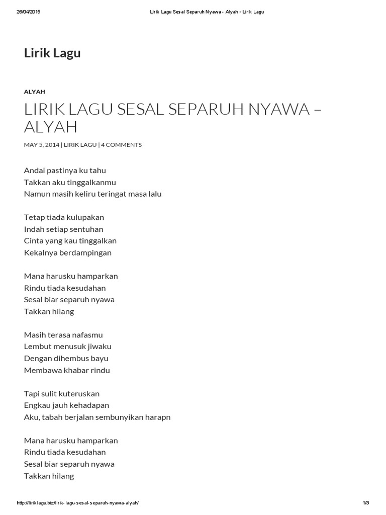 Lirik Lagu Sesal Separuh Nyawa Alyah Lirik Lagu Pdf Document